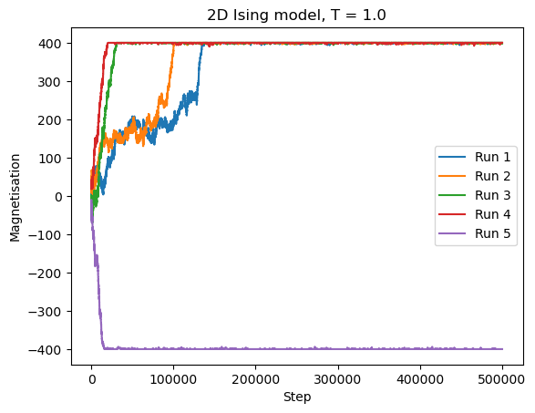 Let us simulate the system at \(T = 1 < T_C\) several times and keep track of the magnetization.